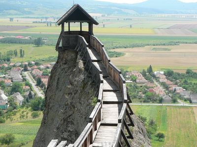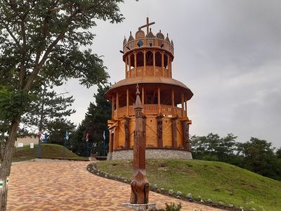 Taras widokowy w kształcie węgierskiej korony królewskiej i zdobiące wioskę drewniane rzeźby i budowle.